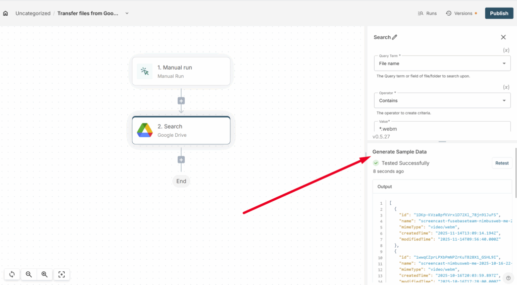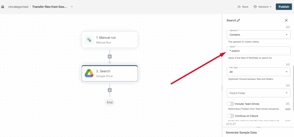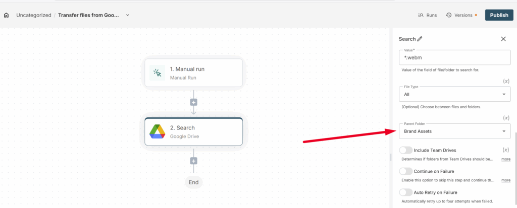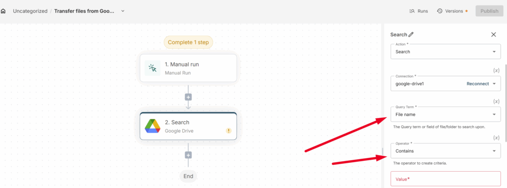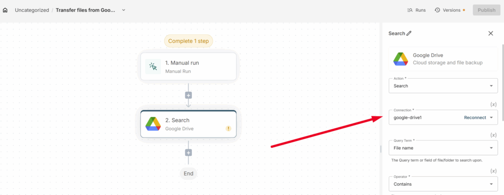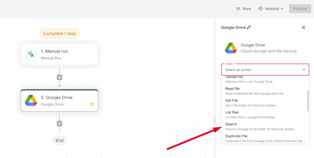 3) Next, we need to prepare a list of files from Google Drive for transfer. To do this, select the action Google Drive -> Search.