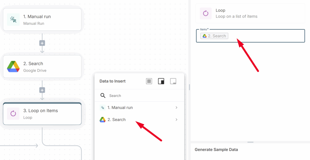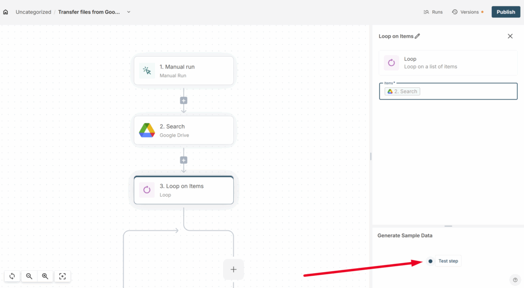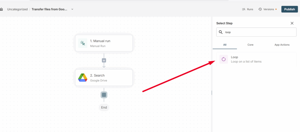 9) We need to transfer not just one file to Fusebase, but all the files found, one by one. To do this, you will use the Loop action, which you need to add.