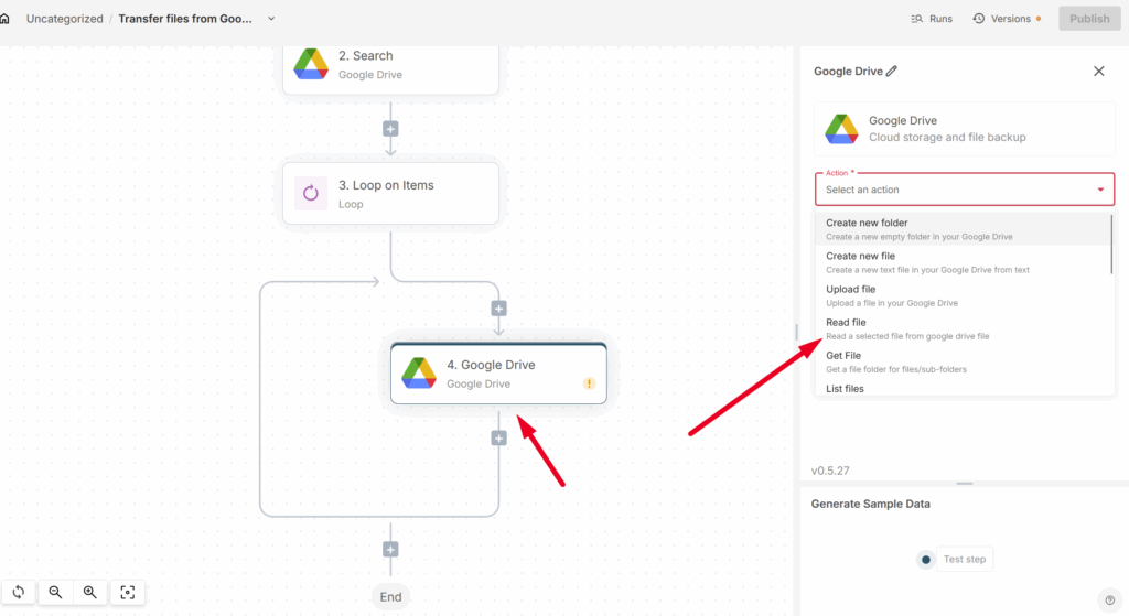 12) Next, we need to get a direct link to the file in order to download it. To do this, within the Loop action, click on + and select Google Drive -> Read.