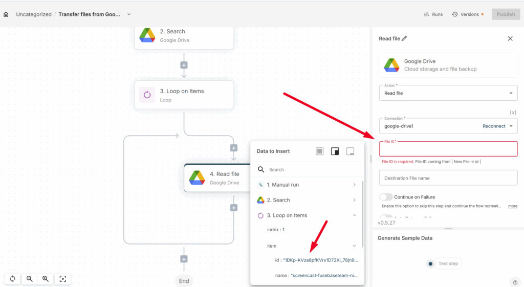 13) In the File ID input, specify the file ID, which you can take from the Loop action –