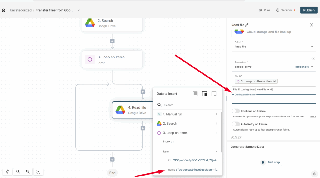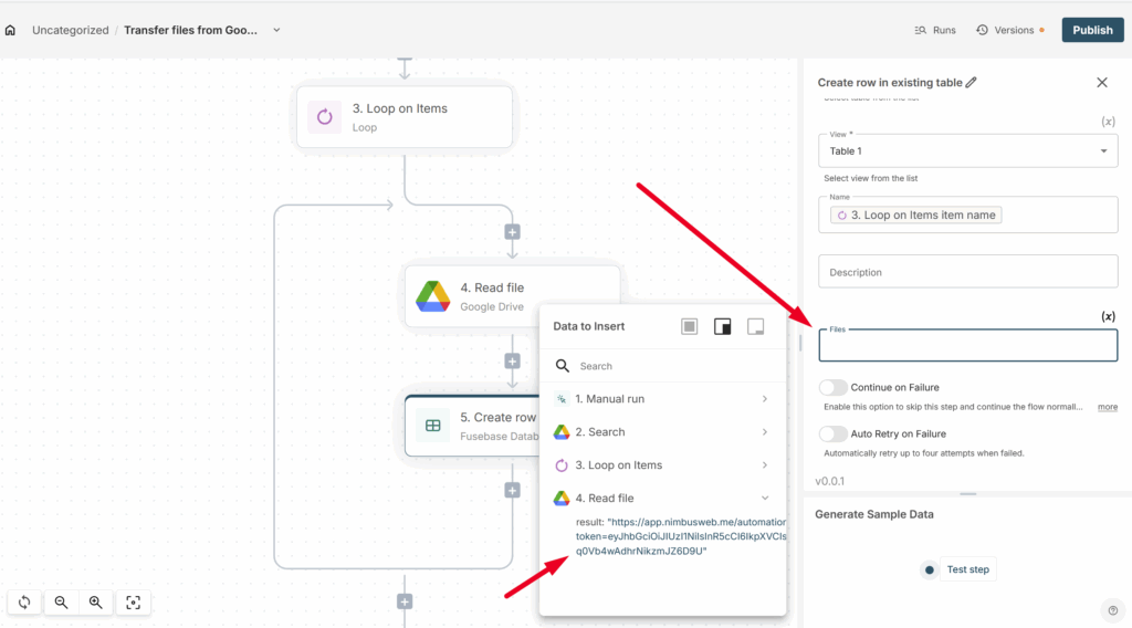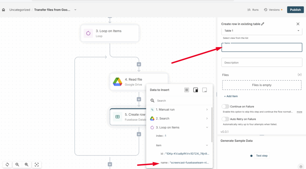 Next, you need to specify the file name and link in the corresponding columns. In the Name field, enter the file name from the Loop action, and in the File field, add the file link from the Read action.