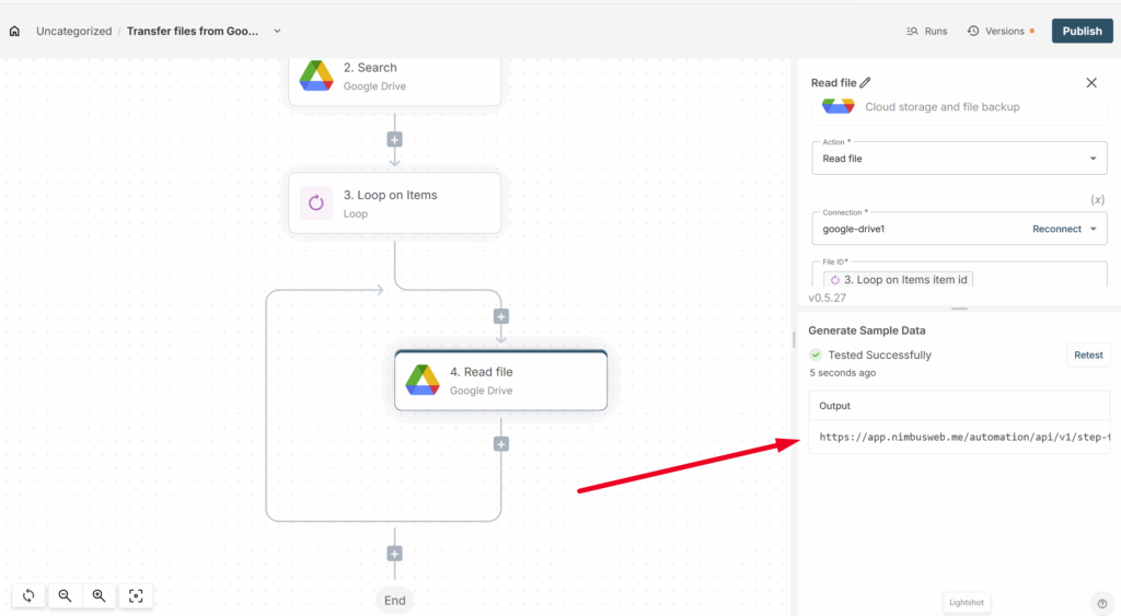 Don’t forget to click on Test Step to retrieve the data (in our case, the file link).