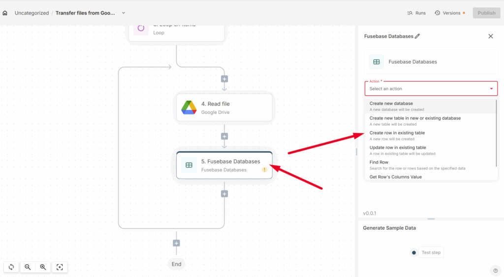 14) Next, we need to add the action for uploading files to the database. To do this, within the Loop action, add Fusebase Database -> Create row.