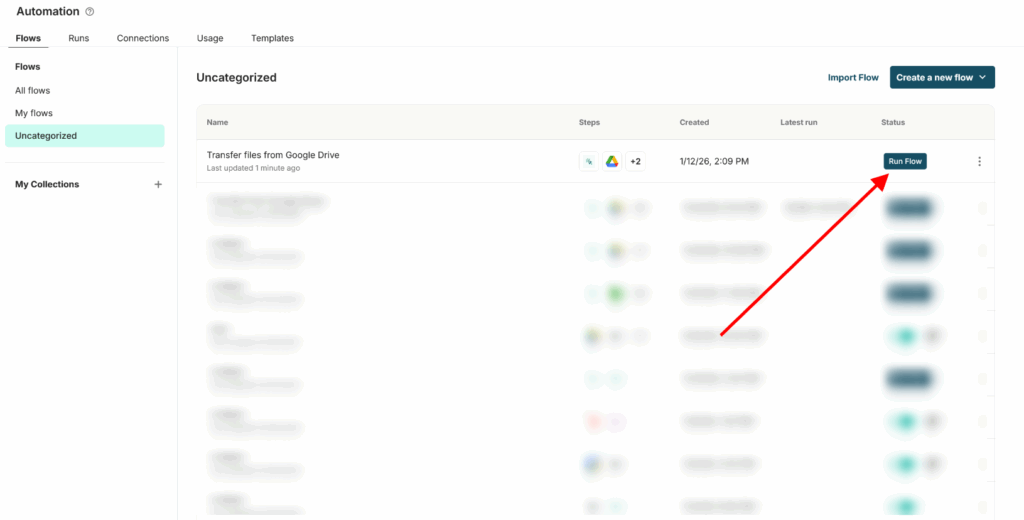 17) Click on Run to start the flow. After the flow has successfully completed, you can change the folder in Google Drive if, for example, you need to transfer files from different folders, and then run the flow again.