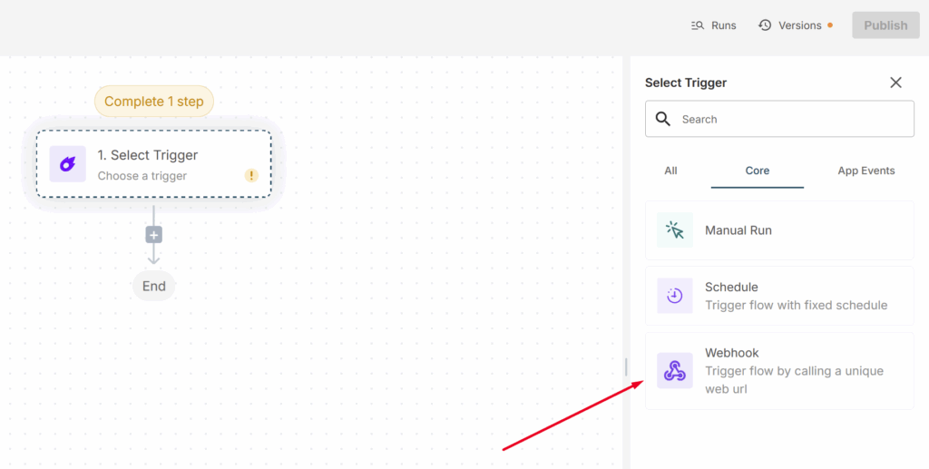 2) Select Webhook as the trigger.