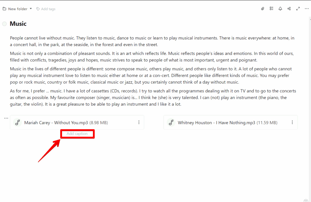 With FuseBase you can add audio files to a page both through the attachment panel and the editor. You can also insert audio into tables.