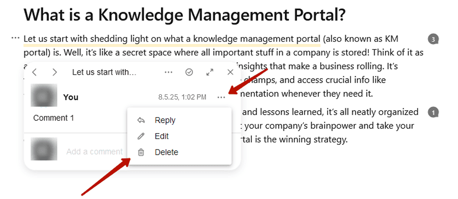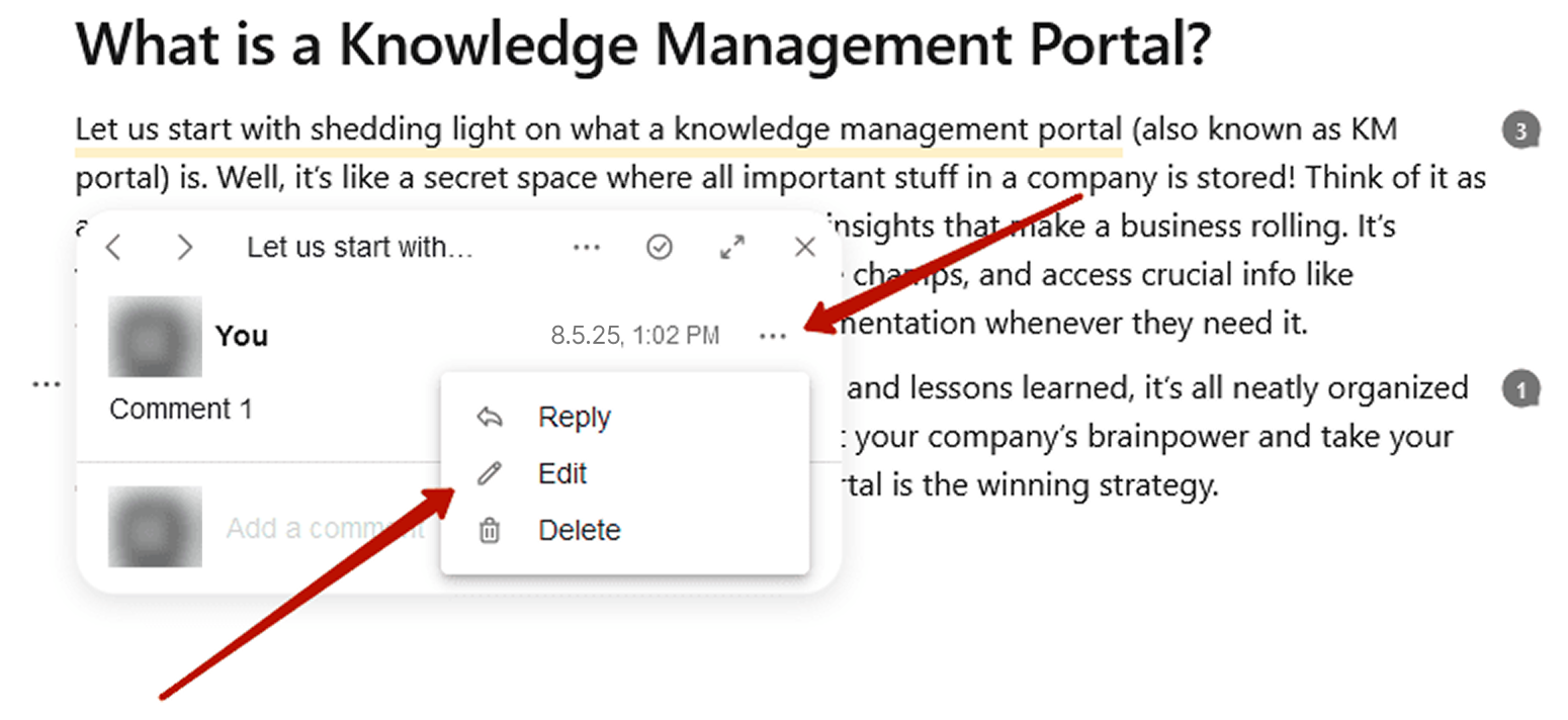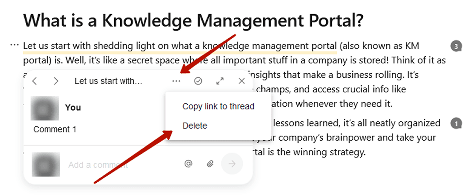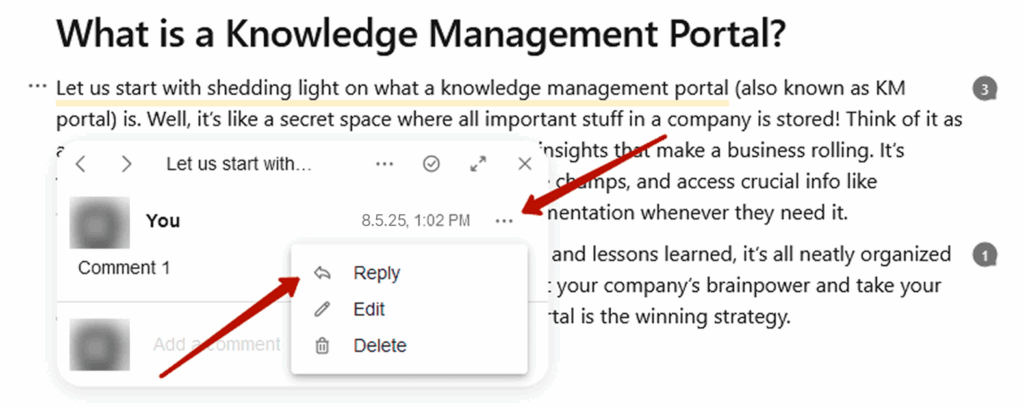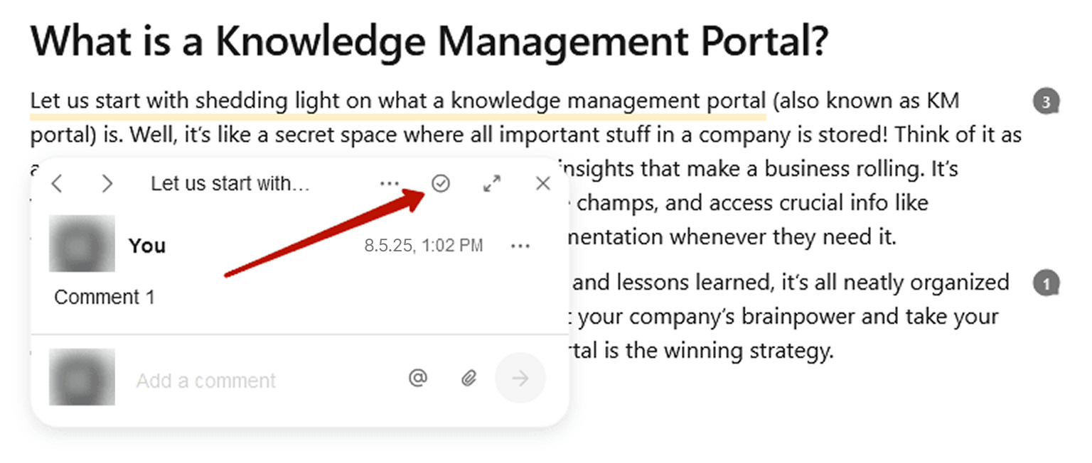 After creating a comment, you will see the commented text is highlighted and the counter icon next to the commented block will appear. The counter defines the number of comments inside the thread.