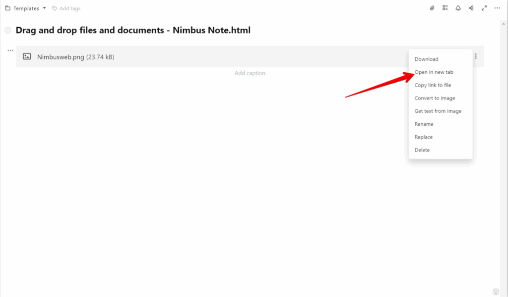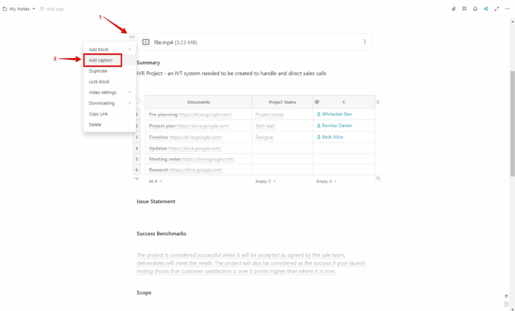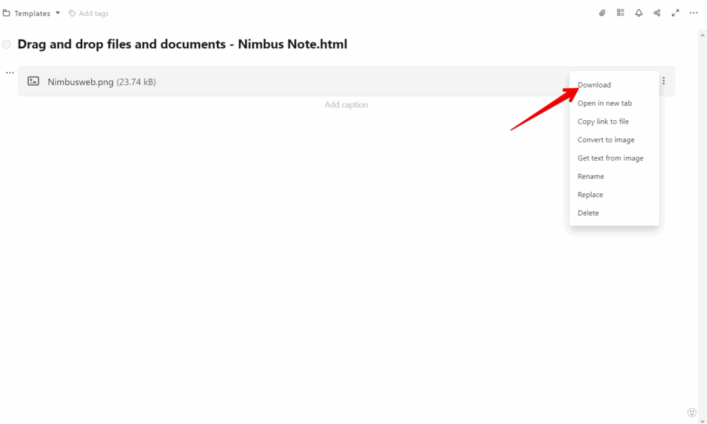 Insert a file into a page and drag the block wherever you want. When files are in a page, you can perform a variety of functions on them, including downloading, renaming, or replacing them.