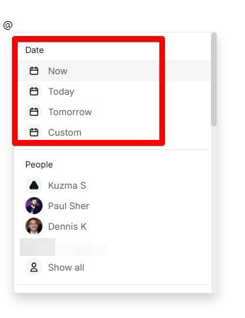 In FuseBase, you can insert a date / time into document body. To insert a date in a document , you need to press @ and select the needed value in Date: today, tomorrow and custom value.
