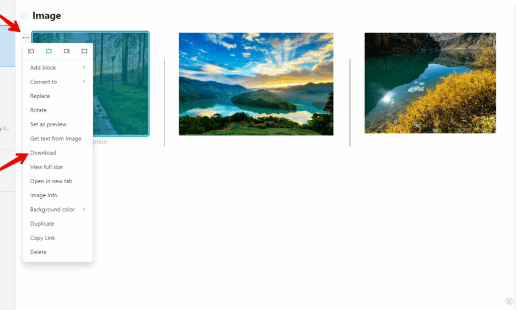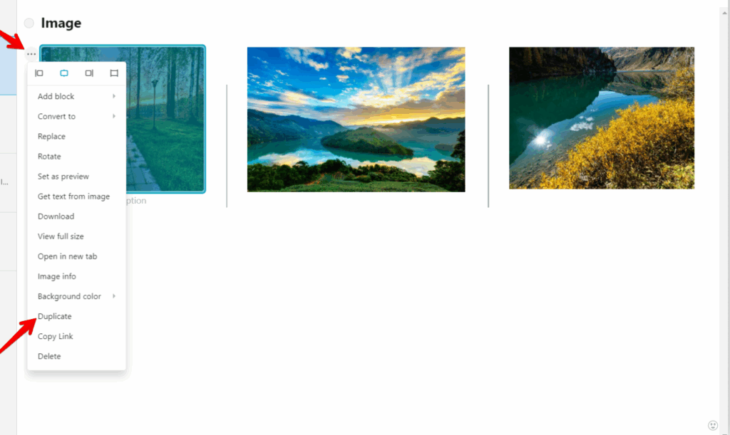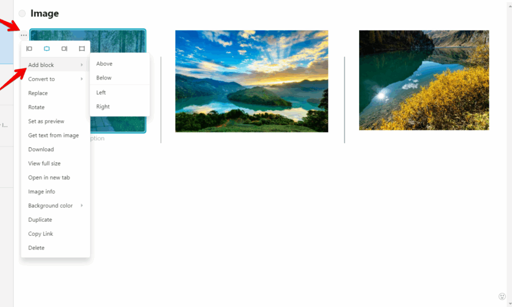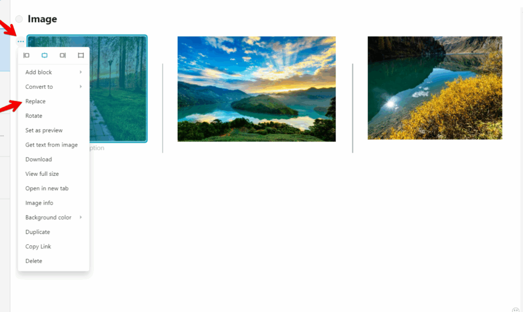 Click the three dots next to an image to open the menu for the picture in the editor.