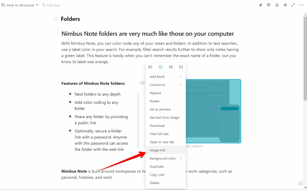 You can see information about a photo, such as its type / size / location. Access by clicking on Image info.