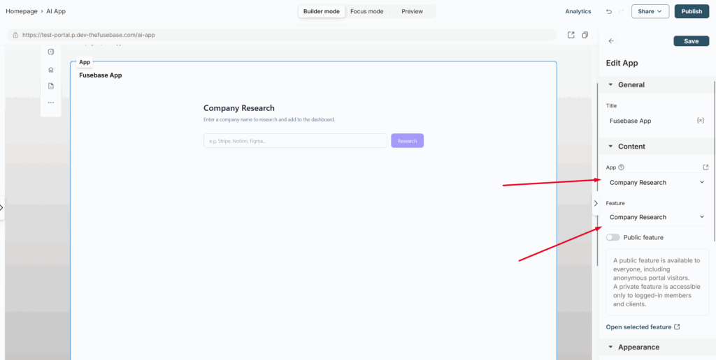 3) Next, select the desired app and the feature you want to add to the portal page.