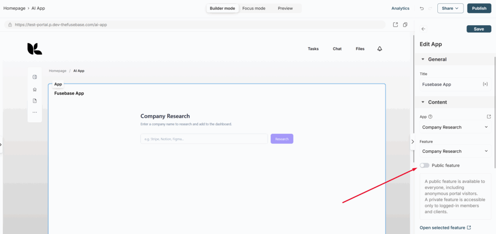 Next, click Publish to make the feature available on the portal.