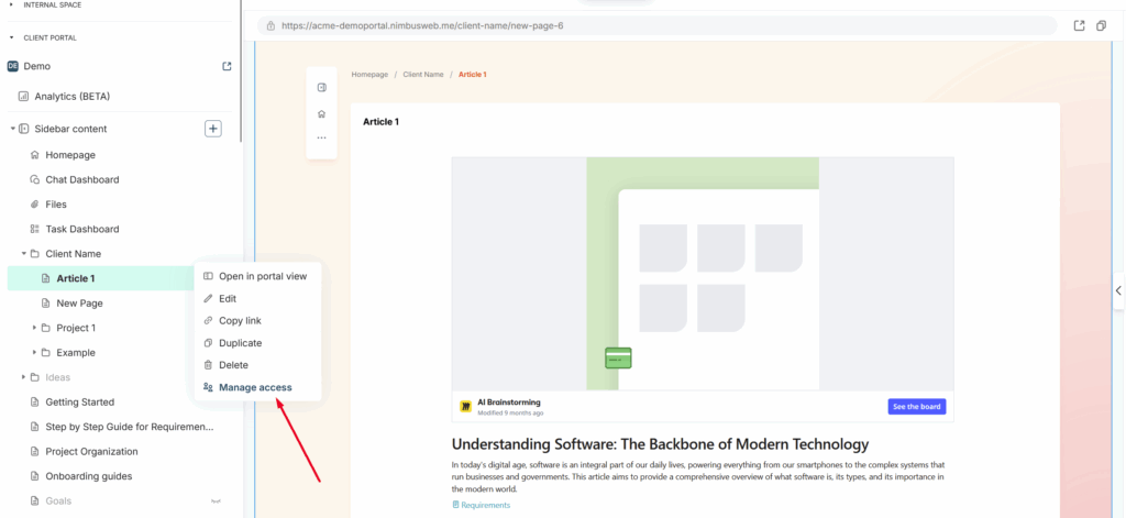 2) Hover over the required item and click the menu. Select the “Manage Access” button: