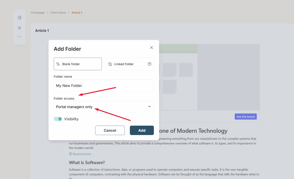 By default, clients have access to all portal content. You can use granular permissions to restrict access to individual folders or pages. For example, one client can have access only to Folder 1 and the other client can have access only to Folder 2, and both clients are unaware of other folders in the portal.