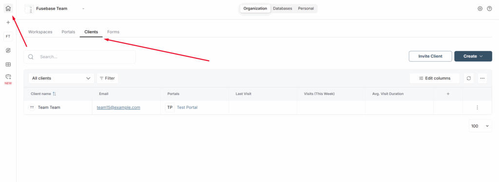 If you want to view all clients who have been added to your portals, you can do this through the client dashboard. To open it, click the Home button and select Clients -.