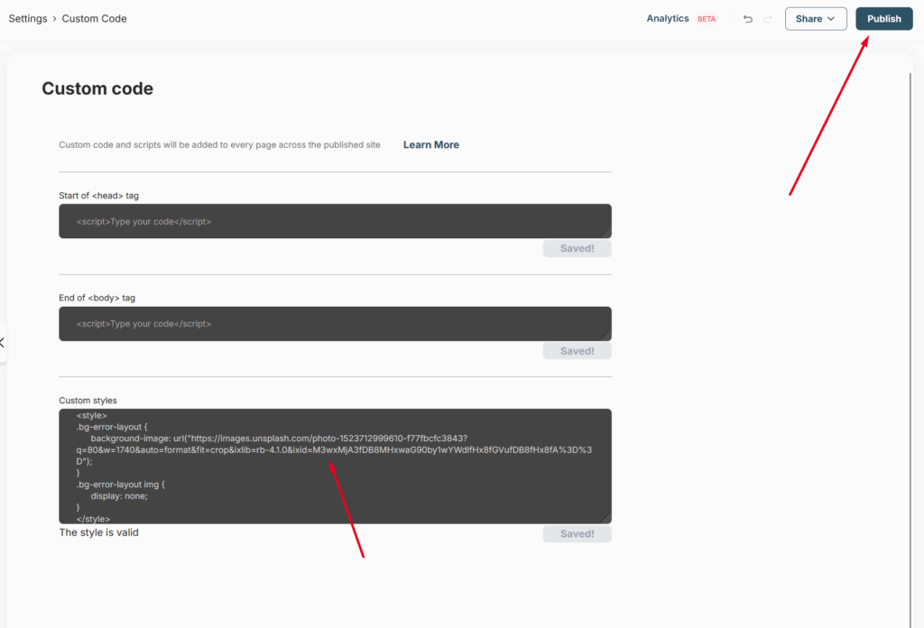 2) Add this code in Custom Style and save and publish it (Important: replace the link with the link to your image.)