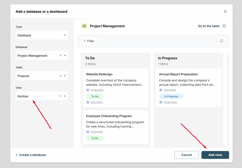 If you need to insert the entire database, select it from the Database list and click Add database. If you want to insert only a table, select the table from the list; if you need a specific view, select the desired view.