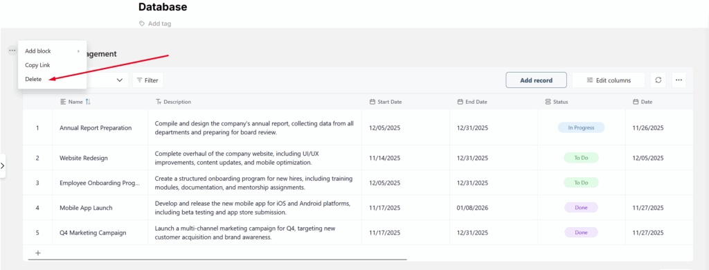 You need to click on the block menu and select Delete. Please note that the table will only be removed from the page, but will remain in the Databases section. Accordingly, if you want to delete the database completely, you need to go to Databases and delete it from there.