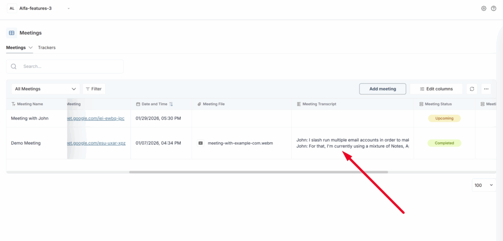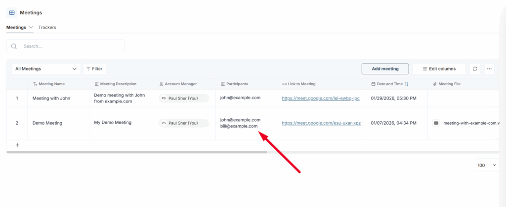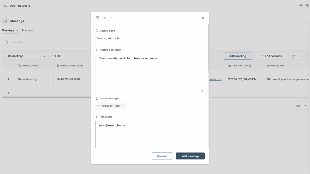 In the meeting dashboard, you can store all your meetings with clients, colleagues, and others. Meetings can be added manually or automatically via calendar integrations, browser extensions, and more.