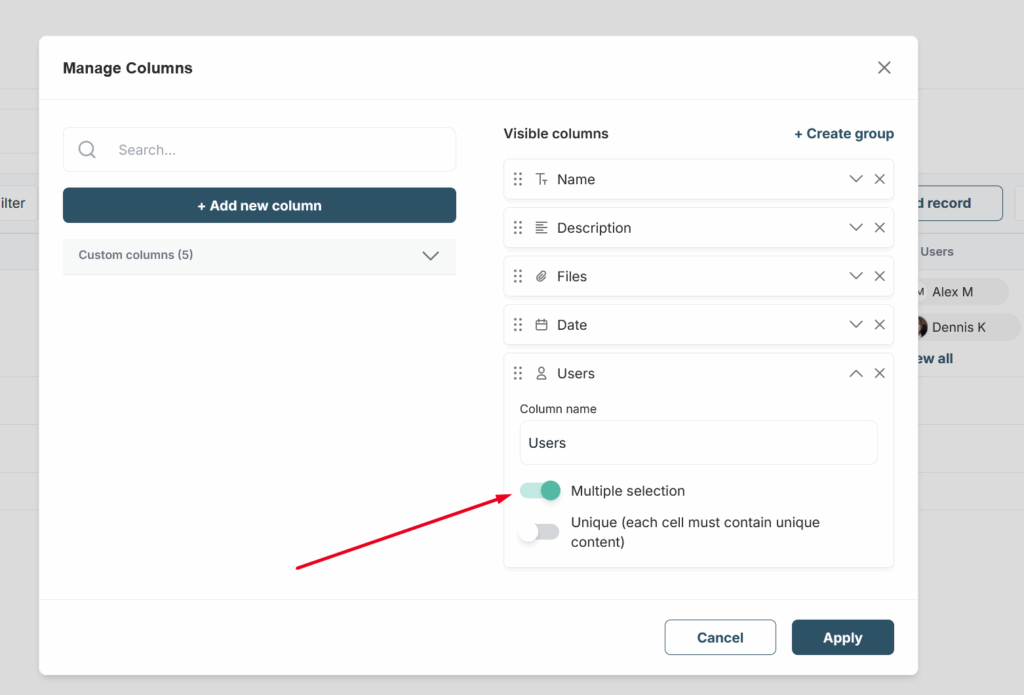 The Users column allows you to add members and clients of the organization to a cell. For example, you can use it to assign those responsible for completing a task, specify department employees, and more.