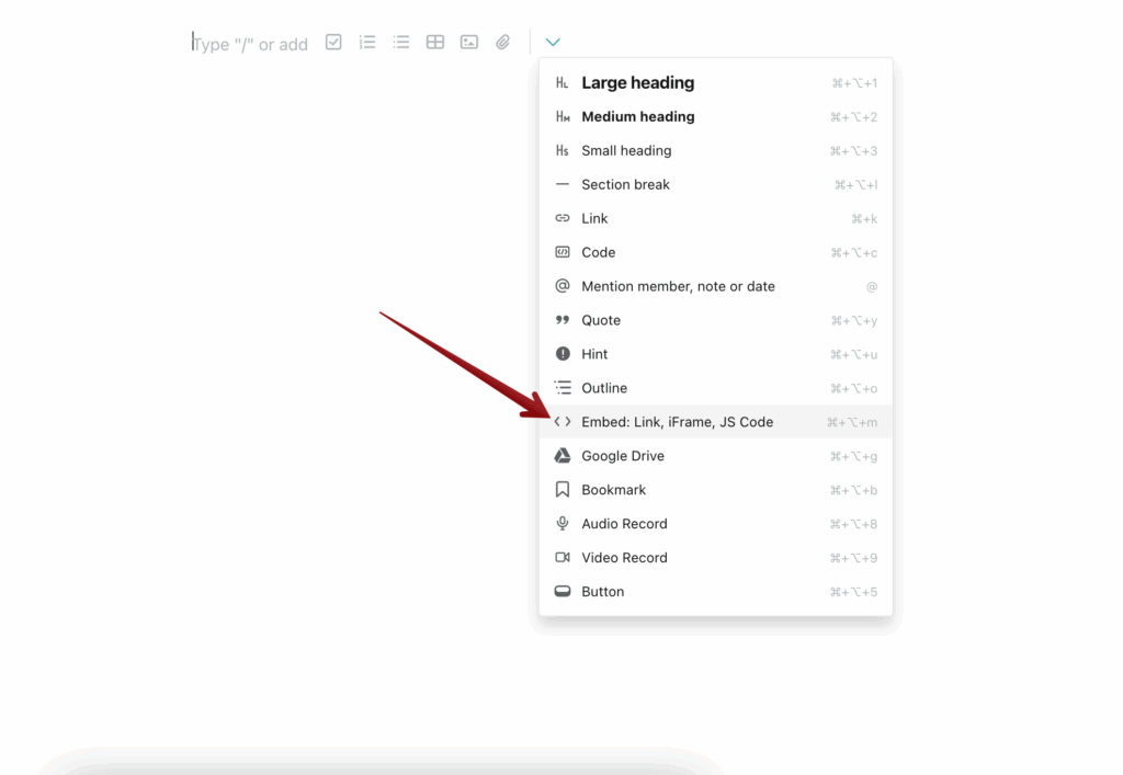 - Click on the arrow and select Embed or use the cmd/ctrl + ⌥/alt + m keyboard combination.
