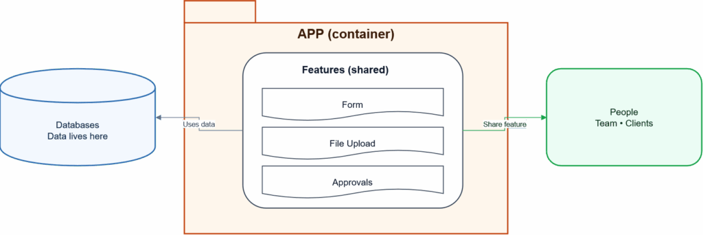 If an App is the “product”, Features are the “modules” that make it useful: one Feature might be a file request flow, another might be approvals, another might be a kanban view.