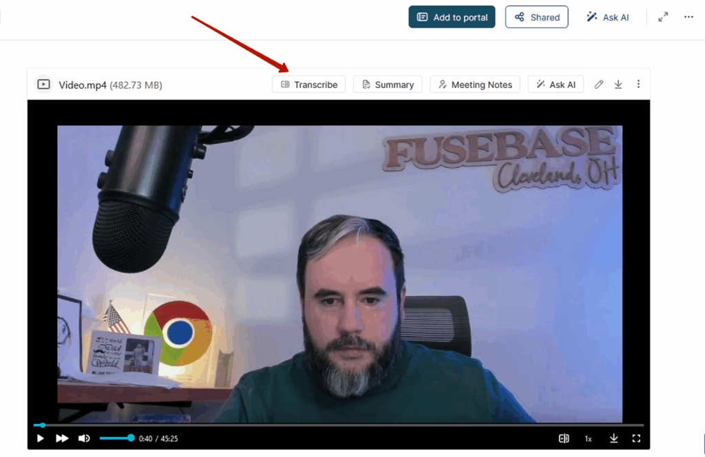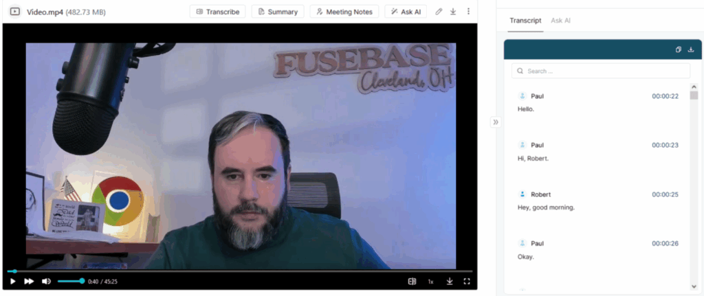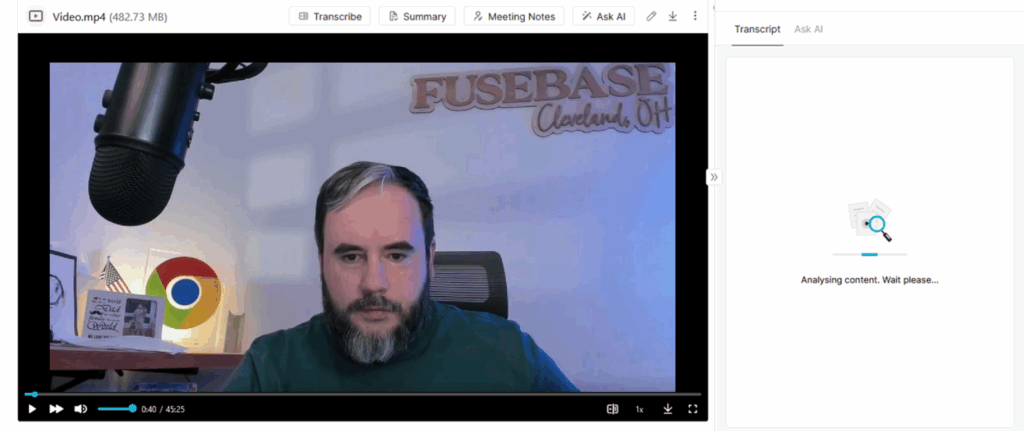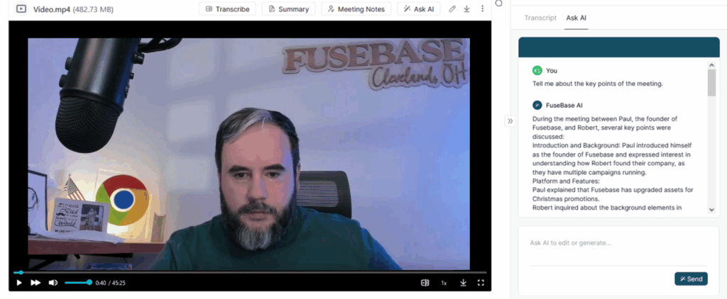 In FuseBase, you can not only view the text from a video but also interact with it using the AI Assistant: you can request a summary, ask clarifying questions about the video, and more.