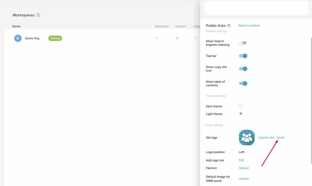 - You can check the modifications instantly on any public link from the desired workspace. You can get the link by clicking on the Share button or through the context menu of a page or folder.