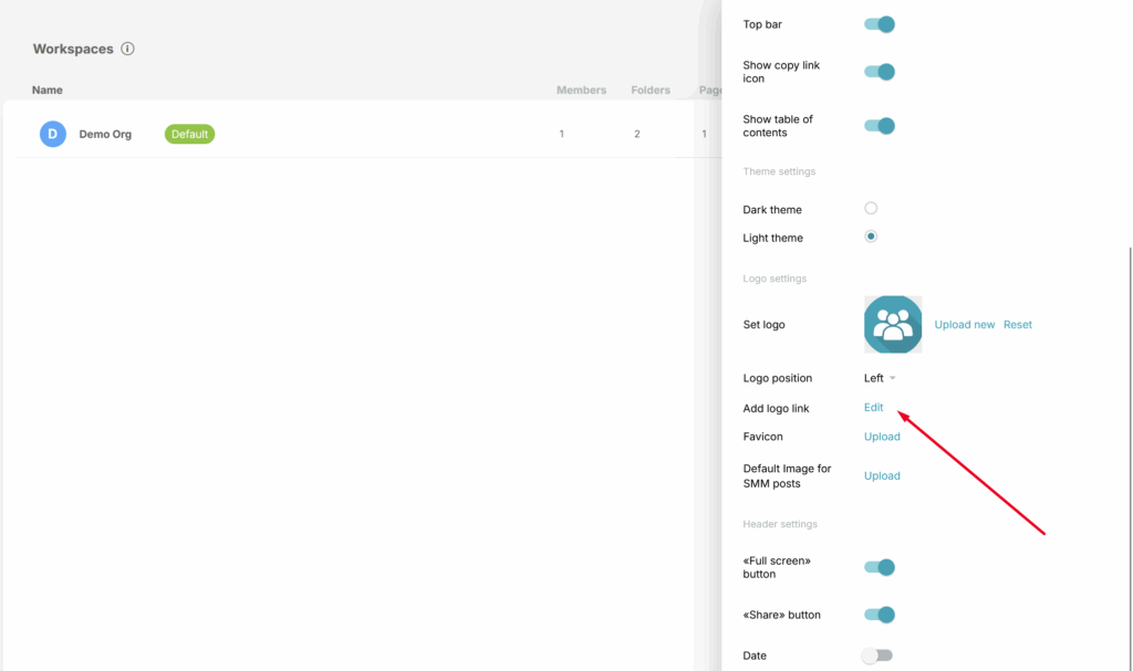 - Also, you can define a link that will open when you click on the logo design. To do this, click Edit in the Logo link and specify the desired link.