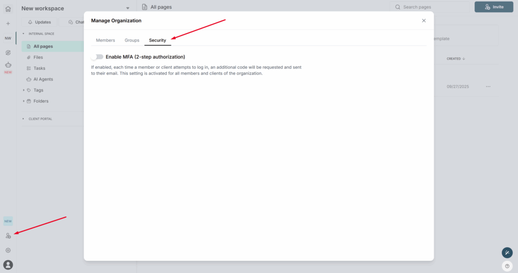 In Fusebase you can enable additional protection for your members and clients through two-factor authentication. This can be done via the Security section in the member management window.