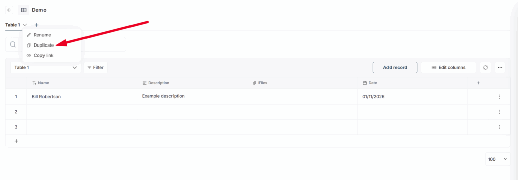 In Fusebase, you don’t always have to create a database or table from scratch. You can use the duplication feature, which allows you to create either a full duplicate with all rows or a duplicate of just the structure (views and columns).