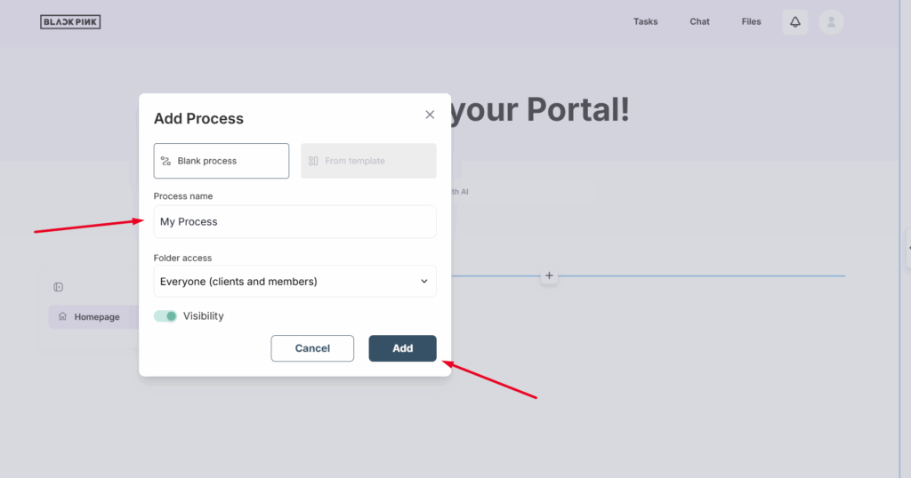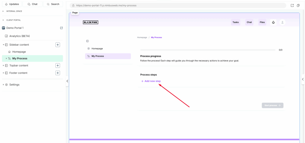 1) Go to the portal customizer and click on the + in the sidebar. Next, select Process.